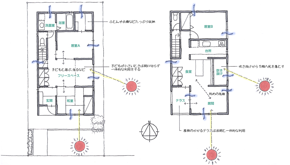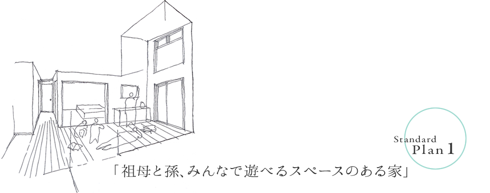 | コンセプト | 子供の成長に合わせて子供部屋を考えることとしたフリーなスペースを、祖母と孫、みんなで遊べる空間に利用する。ハイサイドライトを設けた、明るく、上階の気配を感じ取ることができるフリースペースは、祖母を孤独にしないよう、第二の居間となる。 |