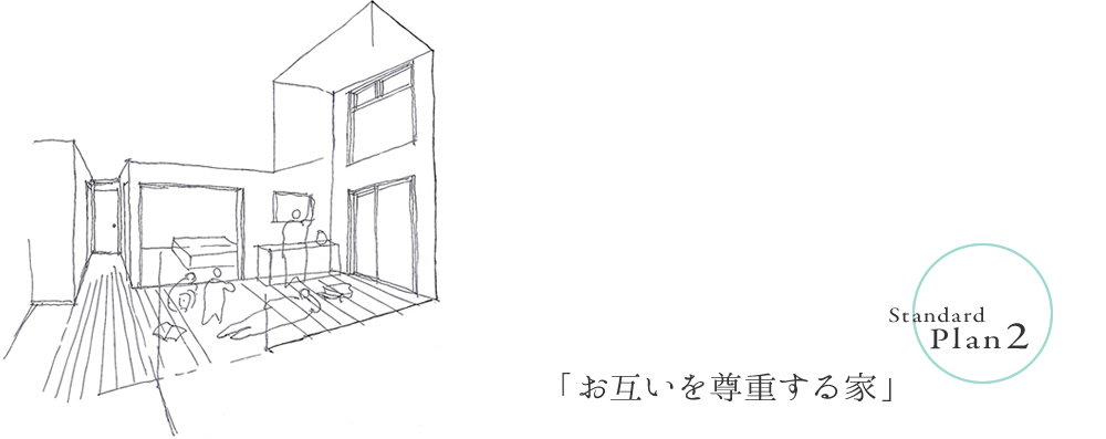 | コンセプト | 個々の生活に干渉しない、つかず離れずの完全分離型の二世帯住居とする。しかし、玄関では扉でのつながりは持ち、その他の必要であれば、階段どうしでもつなぐことができる。 母世帯にも2階での生活(就寝・物干し)が可能なように1部屋設ける。また、水廻りには介護者のスペースを設けておくなど、介護を必要としたときにも対応できる配慮をする。 暗くなりがちな1階の中央部には、階段室とトップライトを設けることにより、明るさを確保し、パントリーとして利用することにより行き止まりのない回遊動線を作り出している。 各リビングには、等分に十分に陽当たりあるように、庭に面してずらした平面計画としている。 |