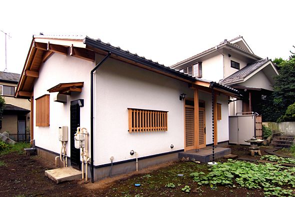 奥の2階屋が母屋で手前の平屋が増築した施主様くつろぎのお宅。 外観は母屋に合わせた和のデザインに仕上げました。 |