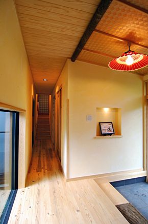 玄関を入ると正面には中庭を見渡せる大きな窓があり、 明るく気持ち良くお客様を迎えてくれます。 廊下より母屋へ続きます。 |