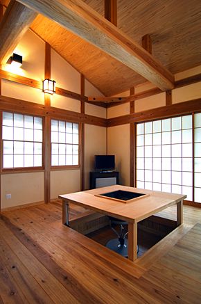 木のぬくもりと香りの立ち込めるリビングダイニング。 掘ごたつと囲炉裏が最高の空間を更に演出してくれます。 |