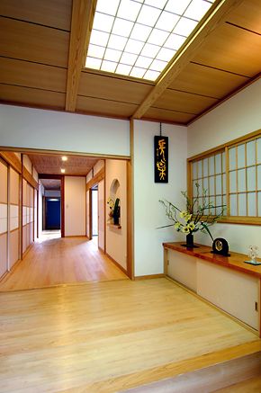 玄関は家の顔。 広々と取り檜と漆喰で仕上げた質感は圧巻です。 |