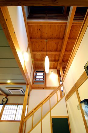 1階~1.5階~2階~ロフトへと 複雑に仕上がった部分を全て見渡せる吹き抜けは、 木の風合いを一番楽しめる場所です。 |