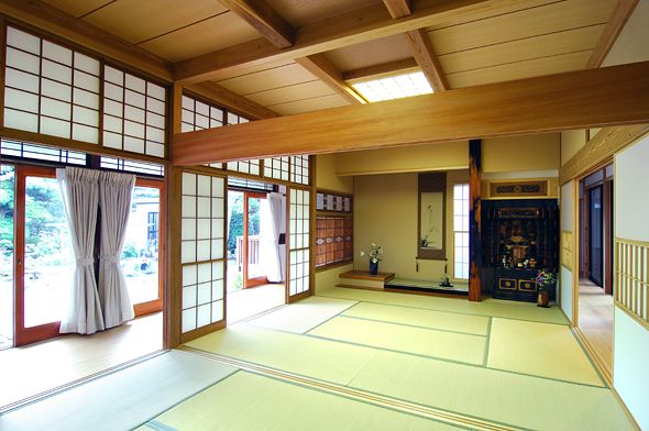 広々とした和室の続き間。部分的に以前の住まいより移設した材料を使い、 また新たに共に生活をする実感と趣きを残した和室です。 |