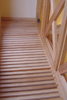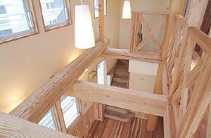 2階の廊下の一部をスノコ状にして明かりを 少しでも1階へ差し込む工夫で更に明るく。 |
