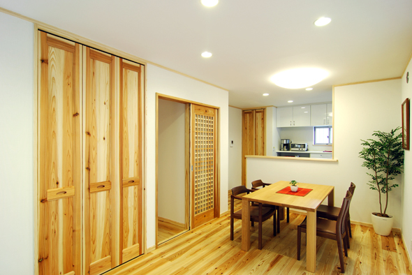 杉で統一した木のぬくもりを感じる1階リビングダイニング。 壁仕上げはでんぷん糊を使用したアトピッコハウスの繊物壁紙「すっぴんクロス」で仕上げました。 |