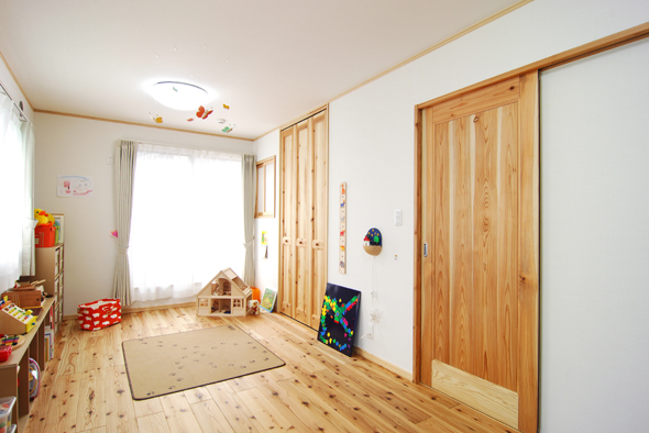2階子供部屋には厚み36mmの杉の床材を張りました。素足にも優しく、自然な温かみを感じさせてくれます。 |