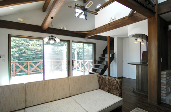 リビング:大黒柱を中心に配置された、アジアンテイストな家具。薪ストーブにBARまで完備。ホームパーティが楽しそうです。 |
