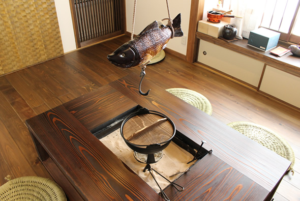 囲炉裏の和室:床に杉の無垢板、天井に黒竹、壁は漆喰で古民家風に仕上げました。中央の囲炉裏テーブルですき焼きや、鍋料理を楽しんでいるようです。 |