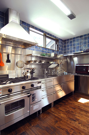 キッチン:趣味の料理をより本格的にする為に、キッチンは火力の強い業務用のガスコンロに。素材は錆にも強いオールステンレスのオーダー製作です。 |