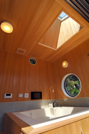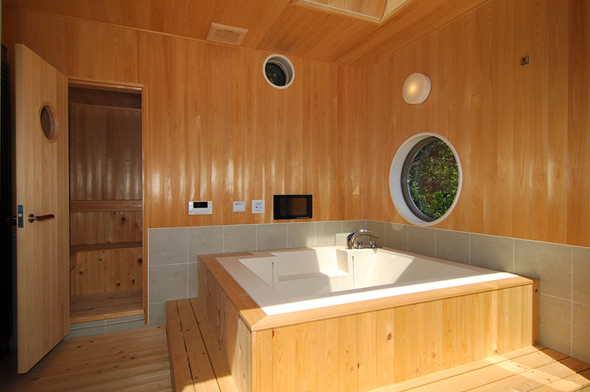 浴室:桧の無垢材の内装です。浴槽に入りながら、海と山々の眺望が望めます。 |