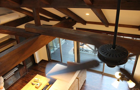 吹き抜けのリビングダイニングを支える柱や大梁は紀州産の杉、桧材で柿渋に灰を混ぜて着色しています。 |
