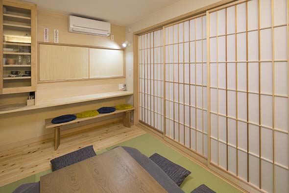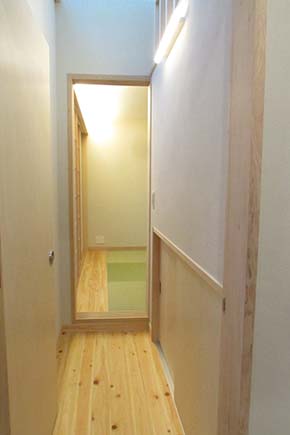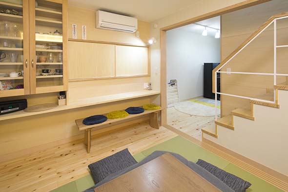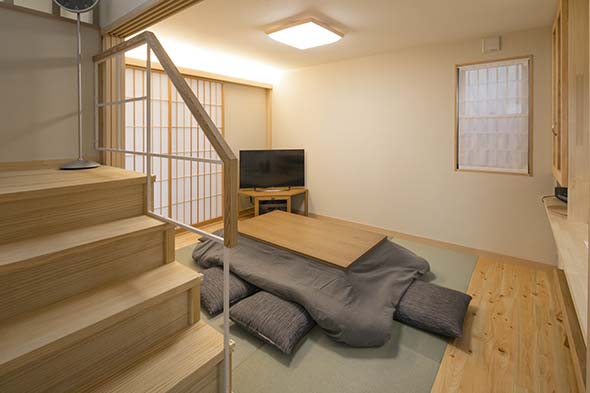 階段から畳スペースを見たところ。中央に配置した掘りゴタツが食卓も兼ねる生活の中心部分です。 引分け障子の上の間接照明が、居心地の良い落ち着いた雰囲気を生み出しています。 |
