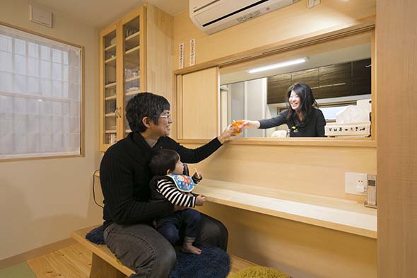 対面カウンターのおかげで、キッチンにいる奥様との連携もスムーズ。 |