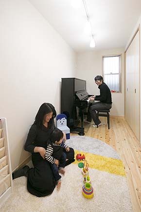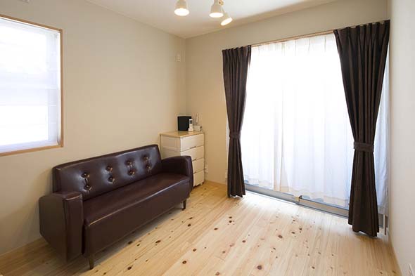 2階南側の子供部屋は、2面開口で日差しがたっぷり。 1階と同様に床は明るい色の檜材、壁は珪藻土で仕上げました。 |