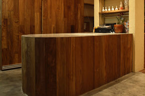 店内の商品棚もチークで作成。床もカウンターもチークで。まるでお洒落な喫茶店にでも来たよう・・・・ 壁は藁入りの漆喰で仕上げました。 |
