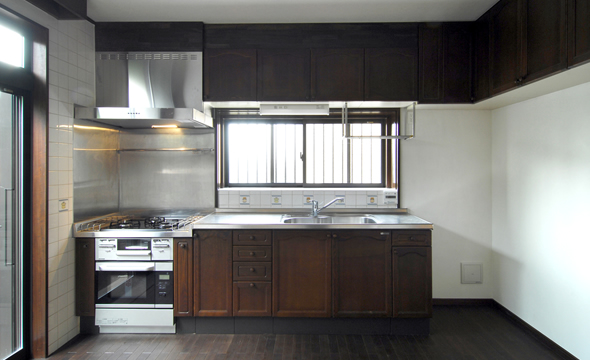 実はこのキッチンセットは改修前の物です。新しくしたものは、ガスコンロ、オーブン、レンジフード、水栓金物、流し手元灯だけです。レンジ前のステンレス板も掃除でこんなに綺麗になりました。キッチン壁のタイルも改修前のものです。