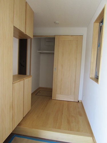 【1階 玄関収納】 床・建具:ウッドワン ピノアース 壁:ワンウィル 珪藻土