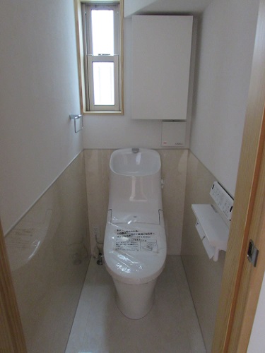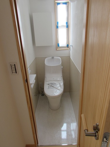 【1階 トイレ】床 、壁(腰まで):パネル 壁(腰うえ):ワンウィル 珪藻土