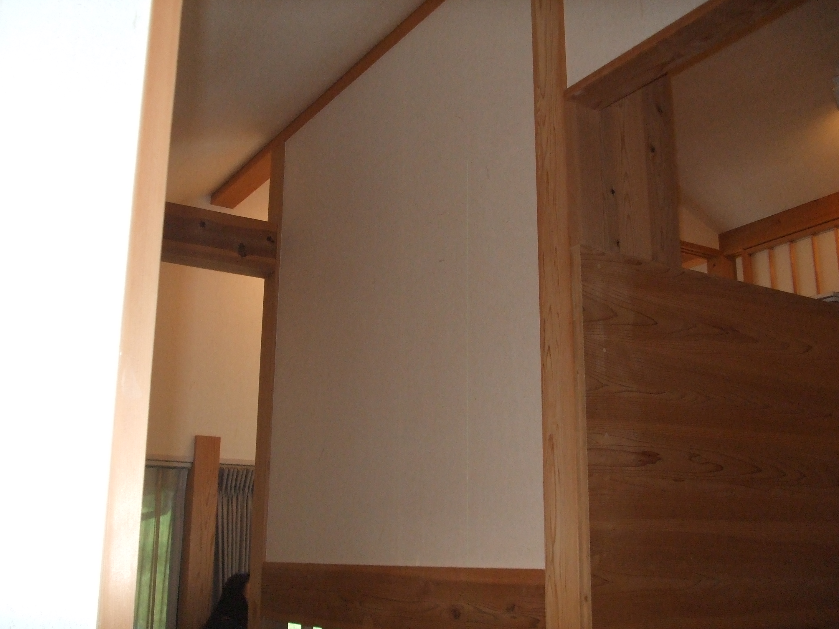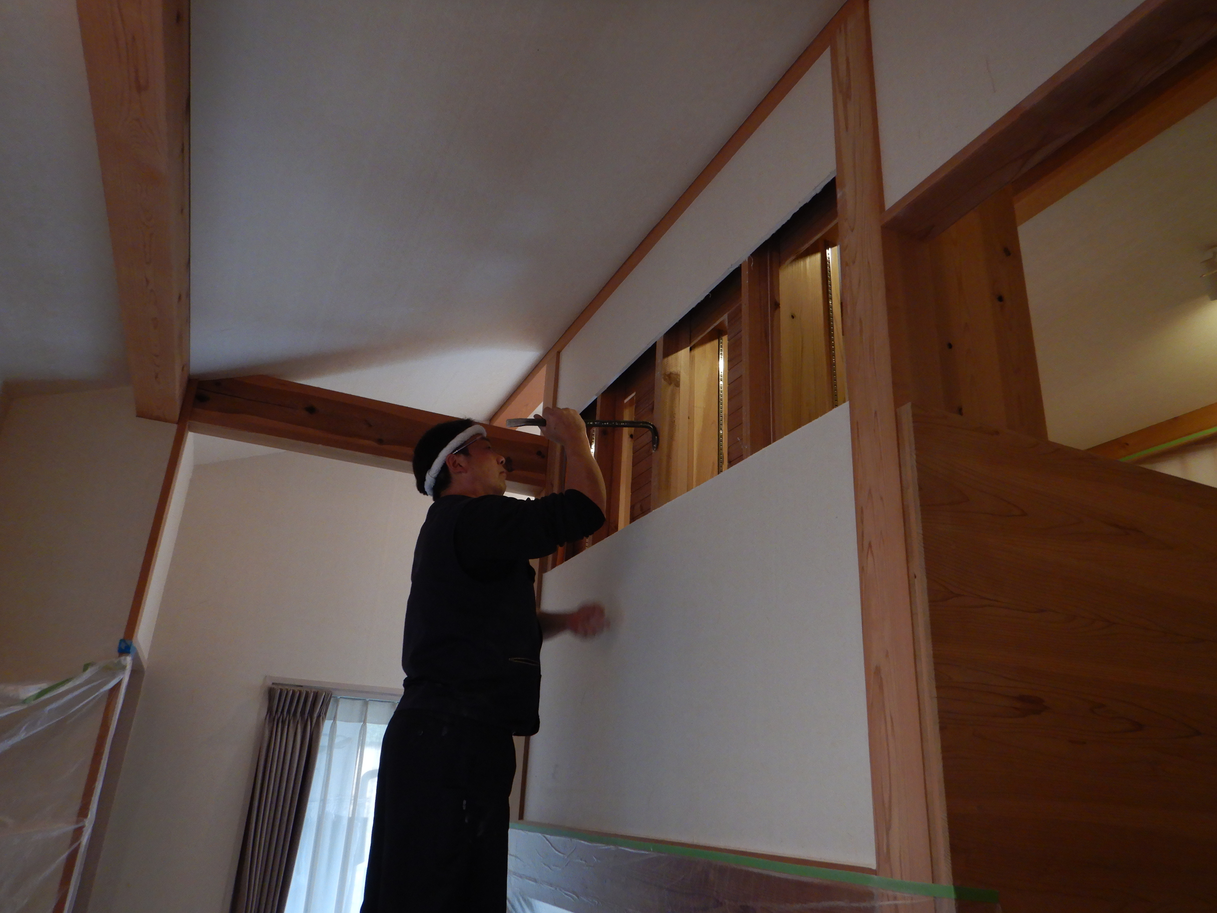 白い壁は和紙貼りということもあり、T大工さんの丁寧な作業が進みます!