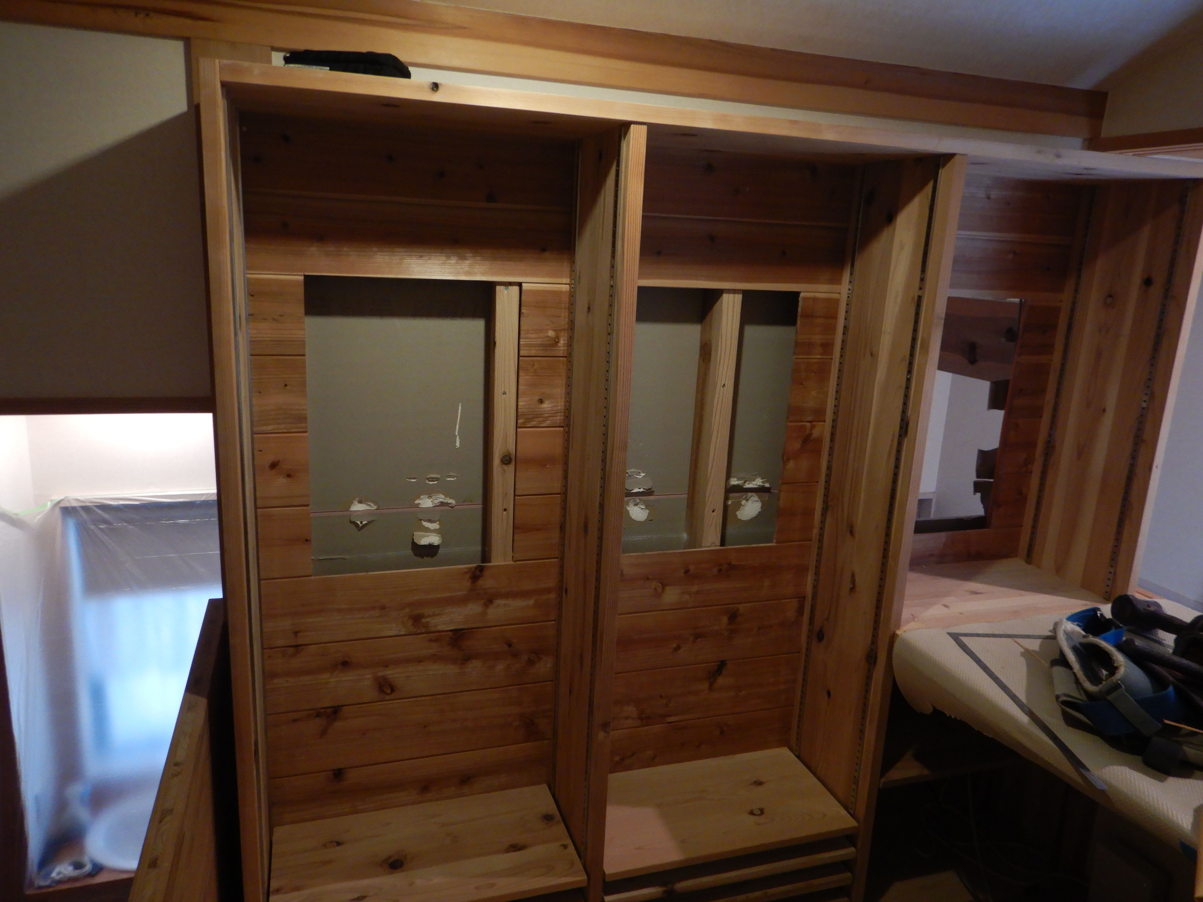 3つの開口の間に新たに杉の羽目板を貼り、新たな壁の表情が生まれました。そして新たな杉板のいい香り^^
