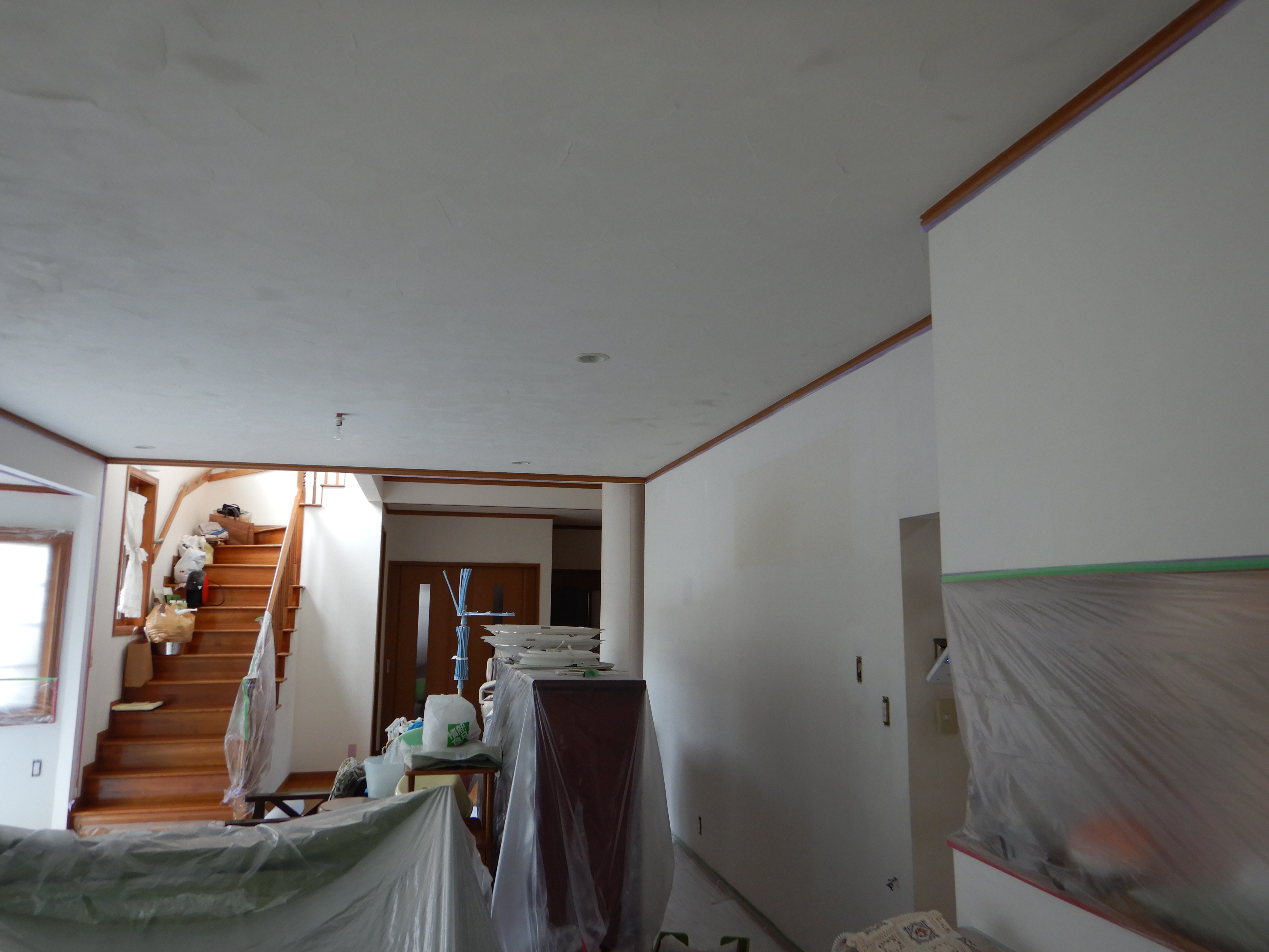梅雨に入る前の先月の1週間程、内装の珪藻土リフォーム工事を行いました。少しでも湿度を抑えられたきれいな空気感や、手仕事の仕上がり感が味わえるようにというご要望にお応えするべく工事が始まりました。広がりあるリビングで愛犬ちゃんも見守ってくれました^^