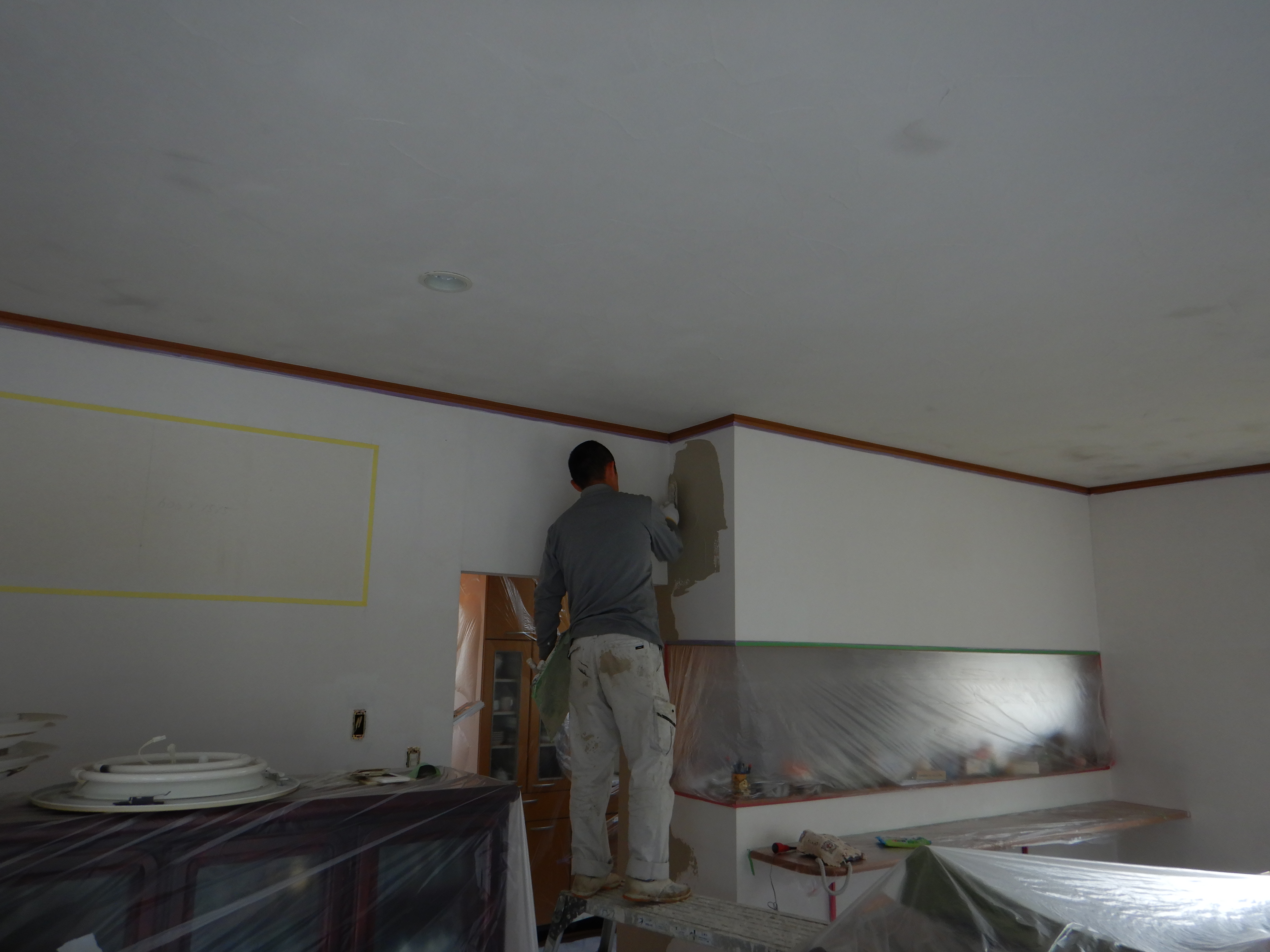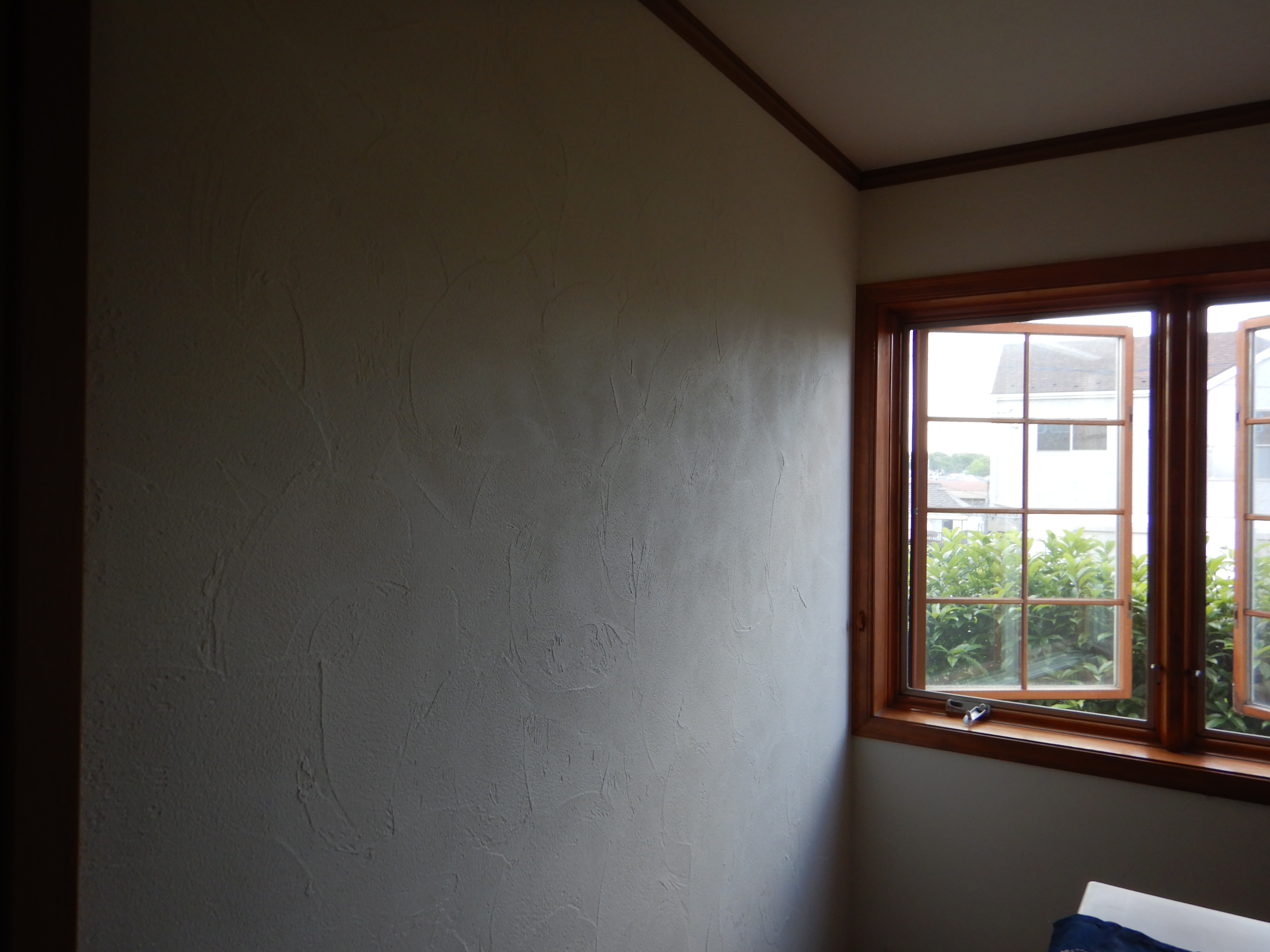 そして壁へ。天井もそうですが、既存のビニールクロスに下地処理をして珪藻土を塗っていきます。天然の素材ですので、作業中の空気もあまり普段と変わりのない匂いで安心です!