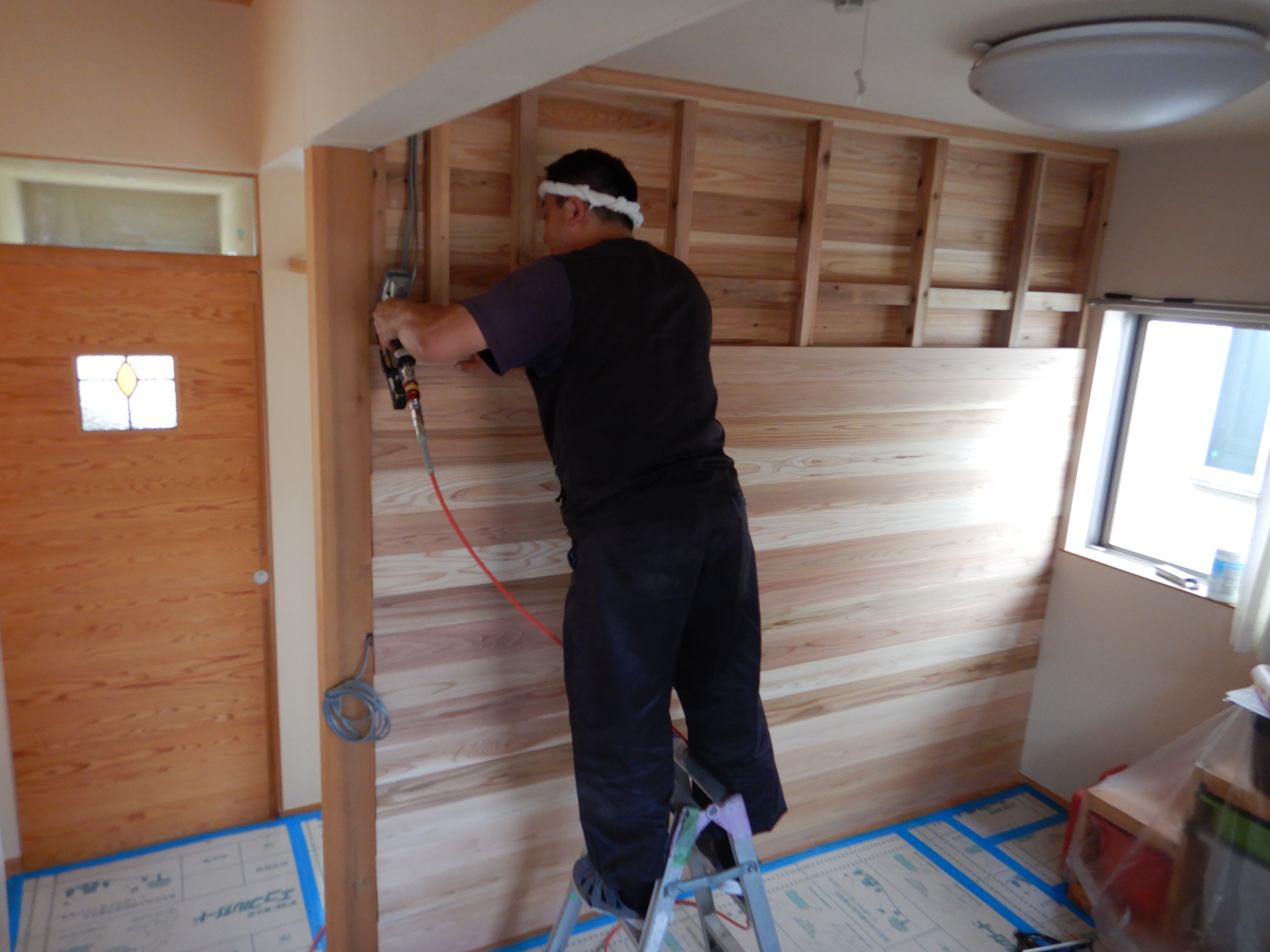 新たな間仕切り壁は杉の羽目板を貼っていきます。片面の羽目板が終わりました。T大工さんの丁寧な作業が続きます。