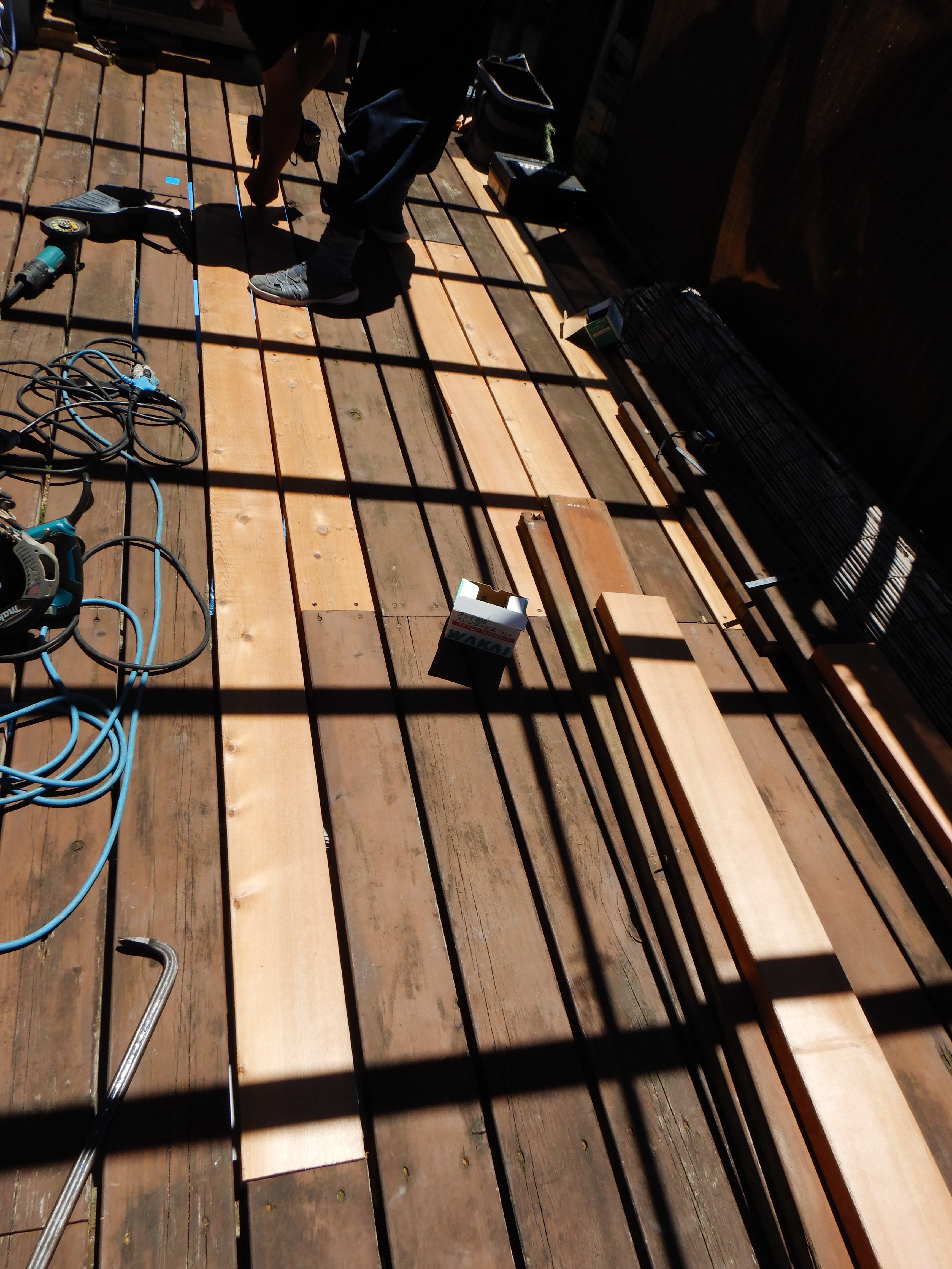 傷んでいるデッキ材をテープでマーキングして外していきます。T大工さん、暑い中ですがよろしくお願いします!