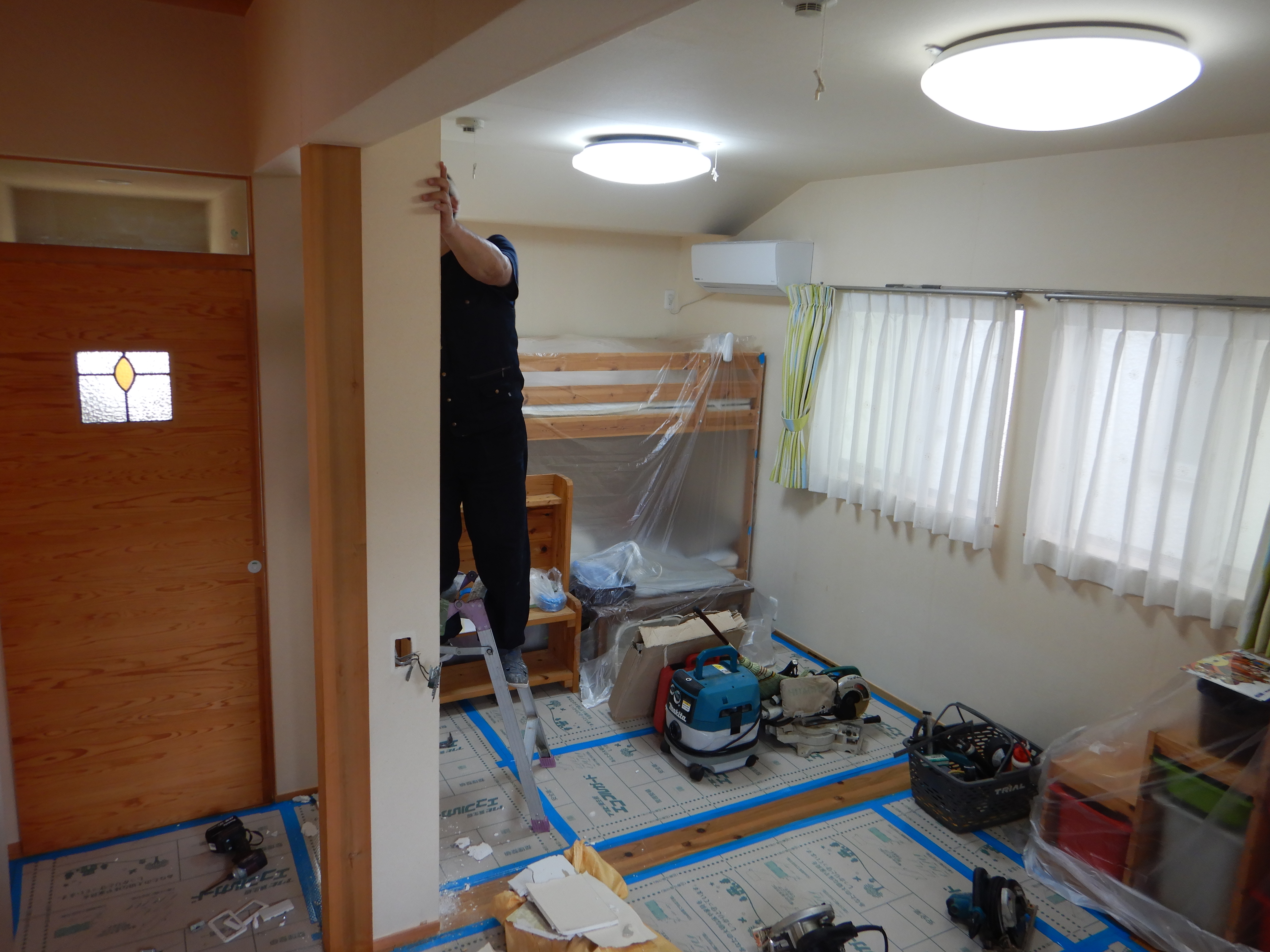 まずは、床や家具の養生から。元の部屋の内装は、床と建具は杉板、壁と天井は和紙貼りです。