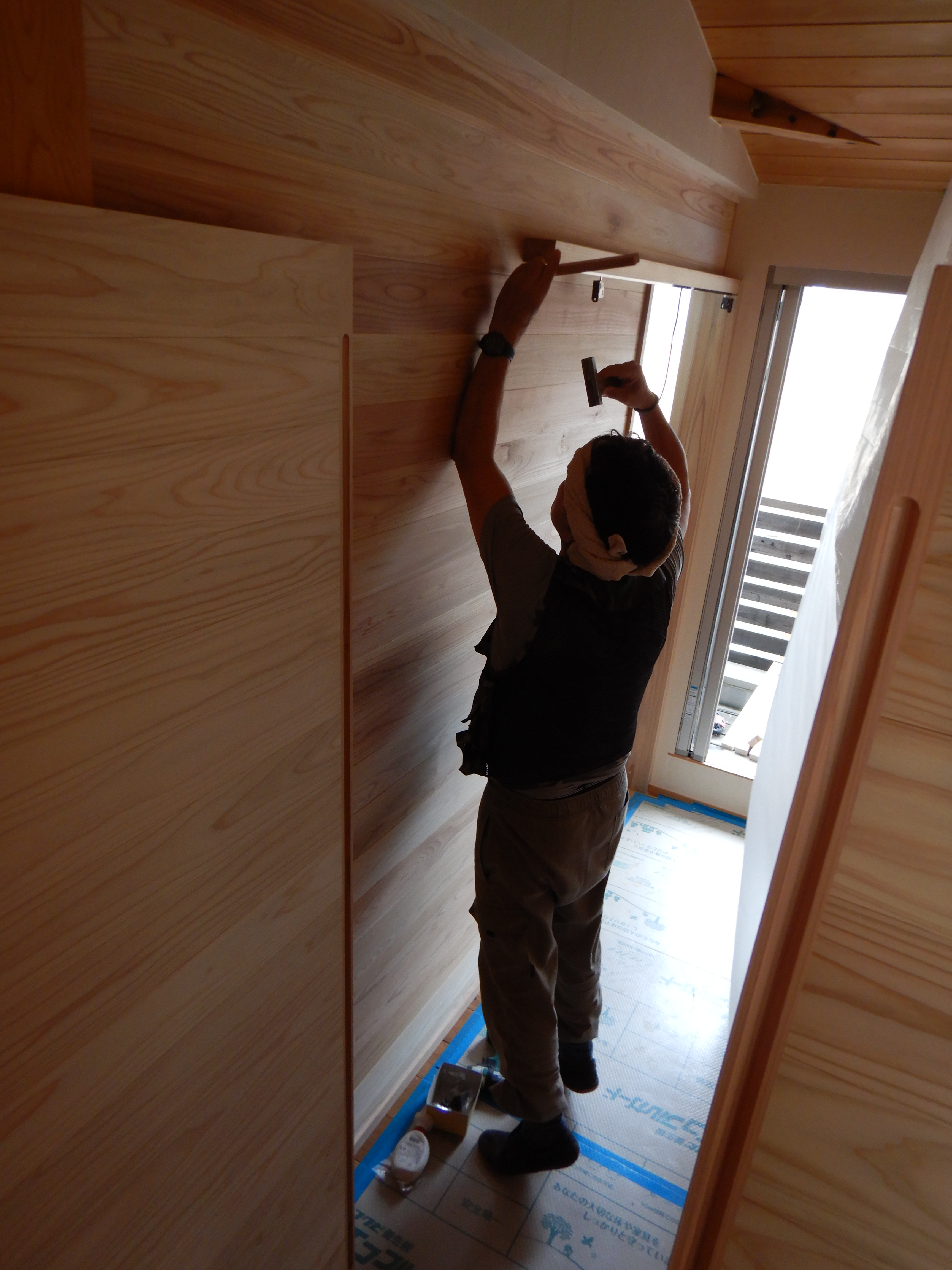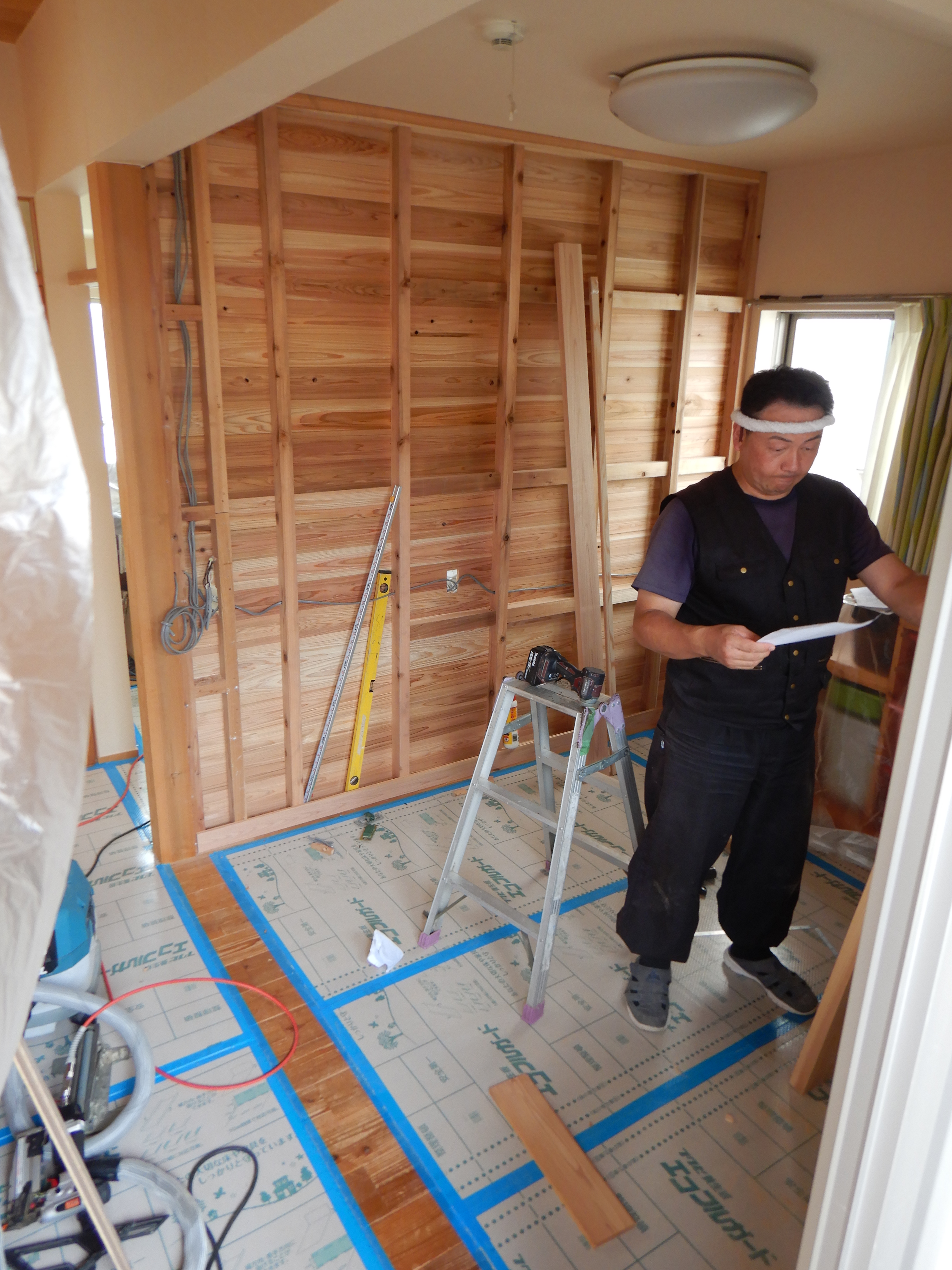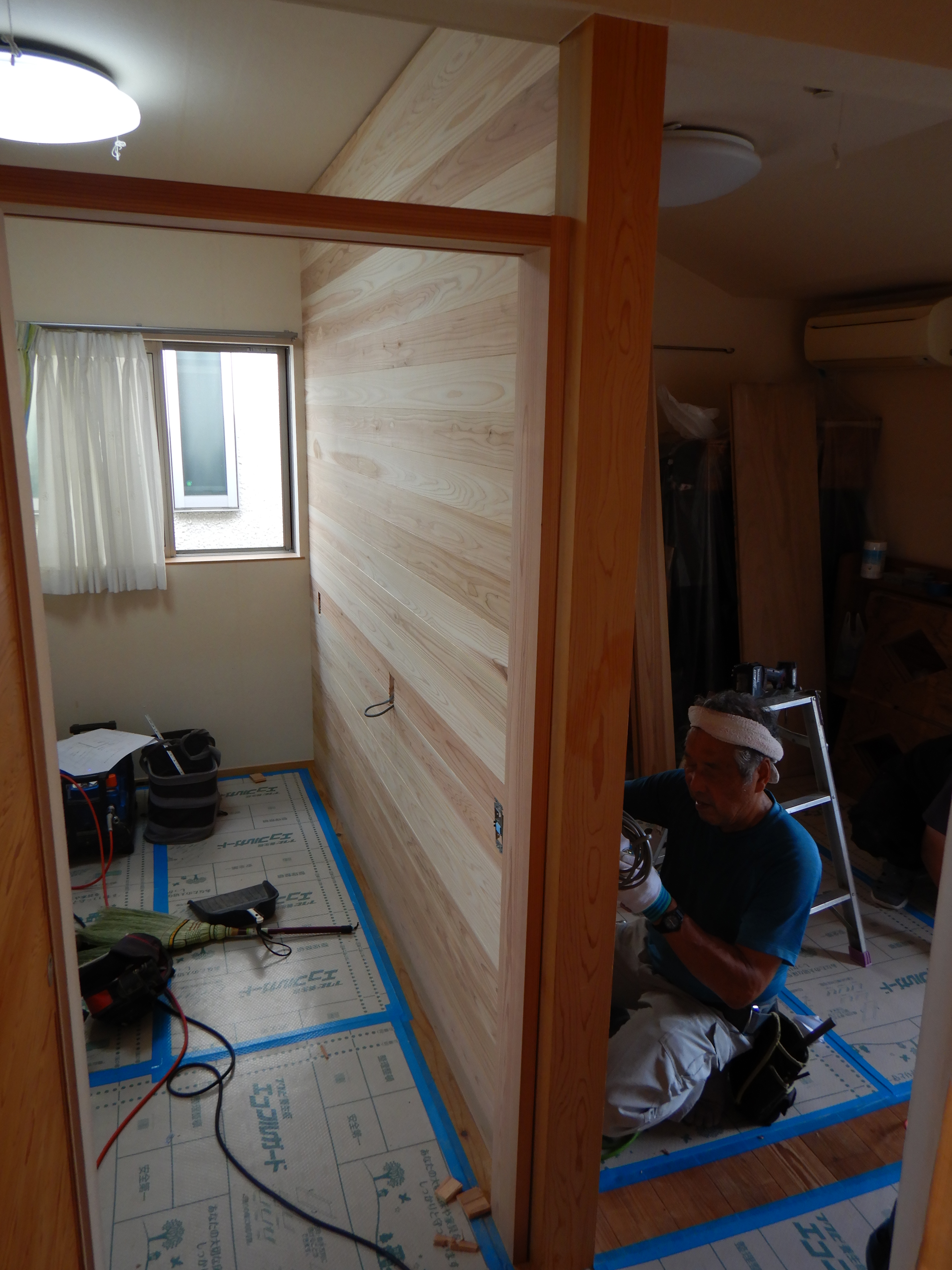 新たな間仕切り壁は杉の羽目板を貼っていきます。片面の羽目板が終わりました。T大工さんの丁寧な作業が続きます。