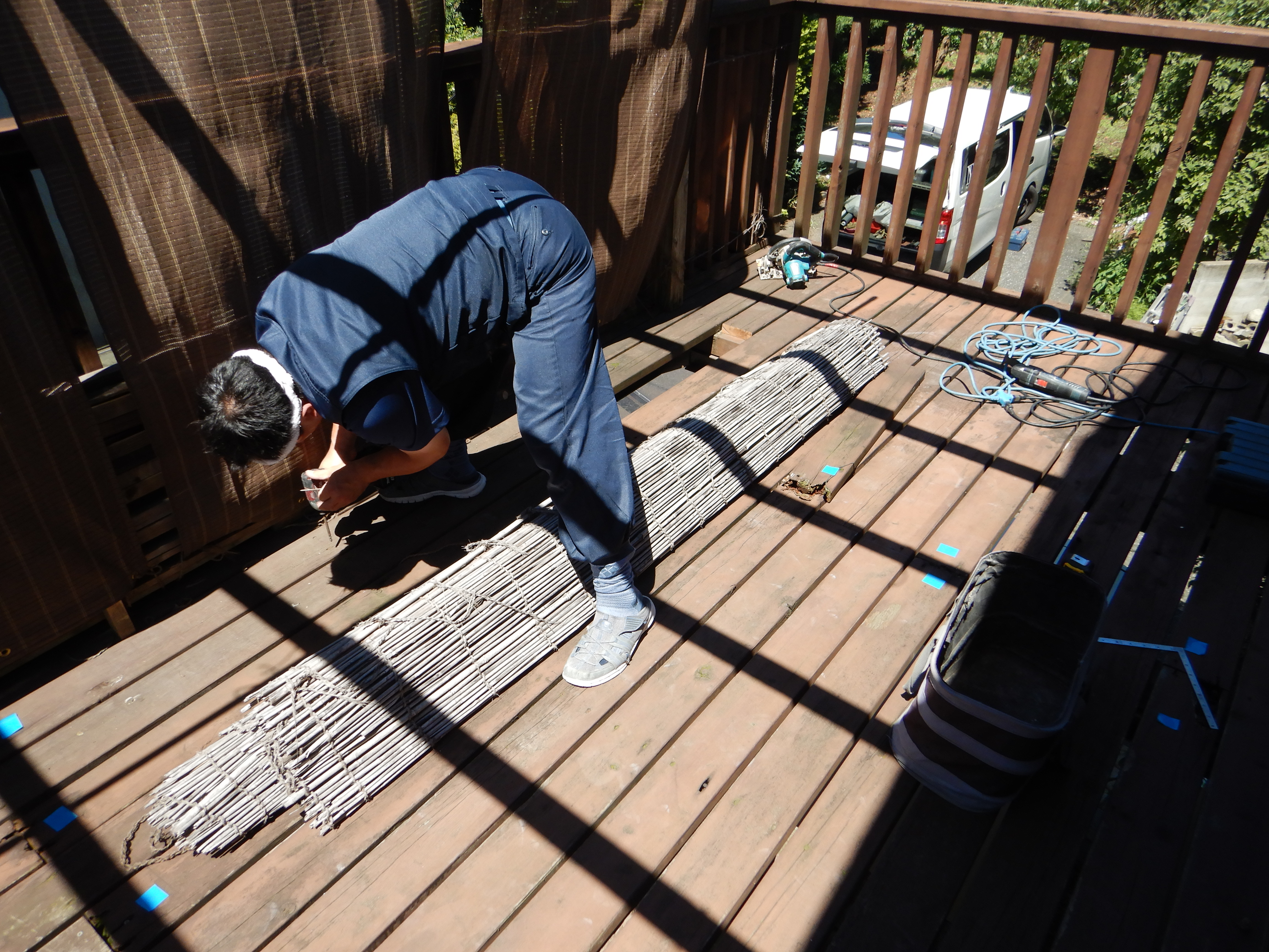 傷んでいるデッキ材をテープでマーキングして外していきます。T大工さん、暑い中ですがよろしくお願いします!