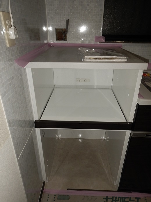 システムキッチンの隣に家電収納キャビネットを設置して、